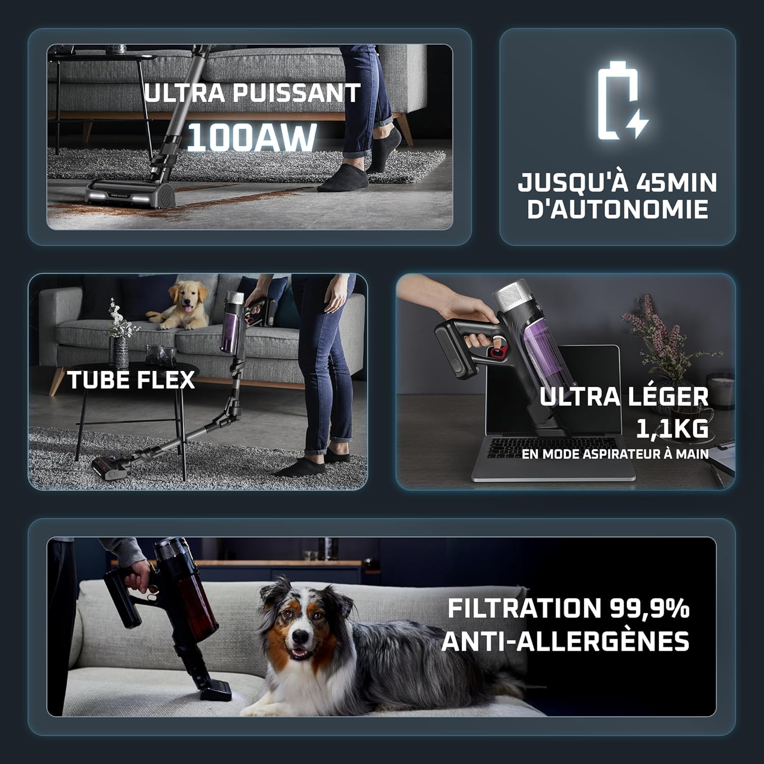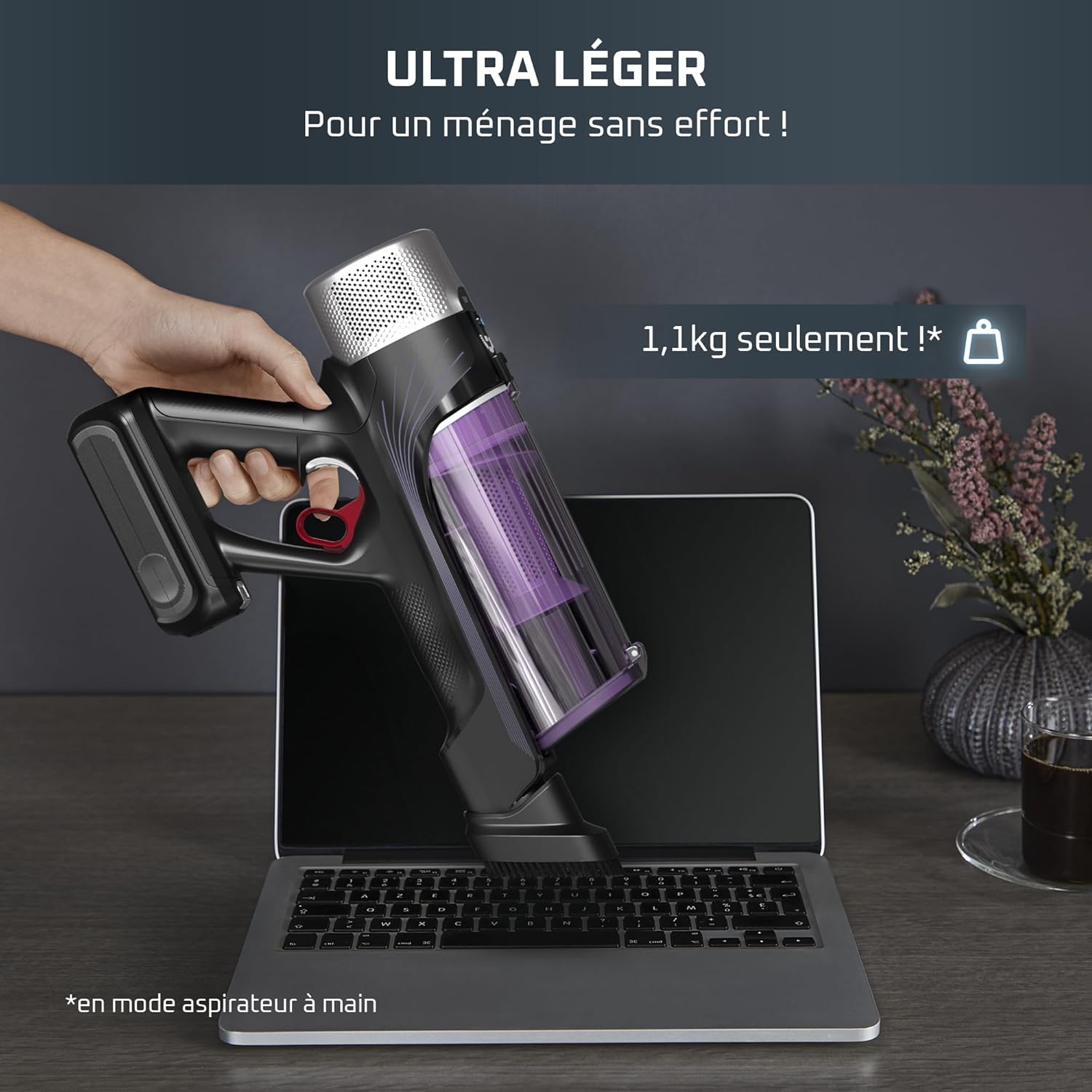 - ULTRA-LÉGER : design fin et compact pour une expérience de nettoyage en toute légèreté , seulement 1,1 kg en mode aspirateur à main pour un confort d'utilisation total, jour après jour