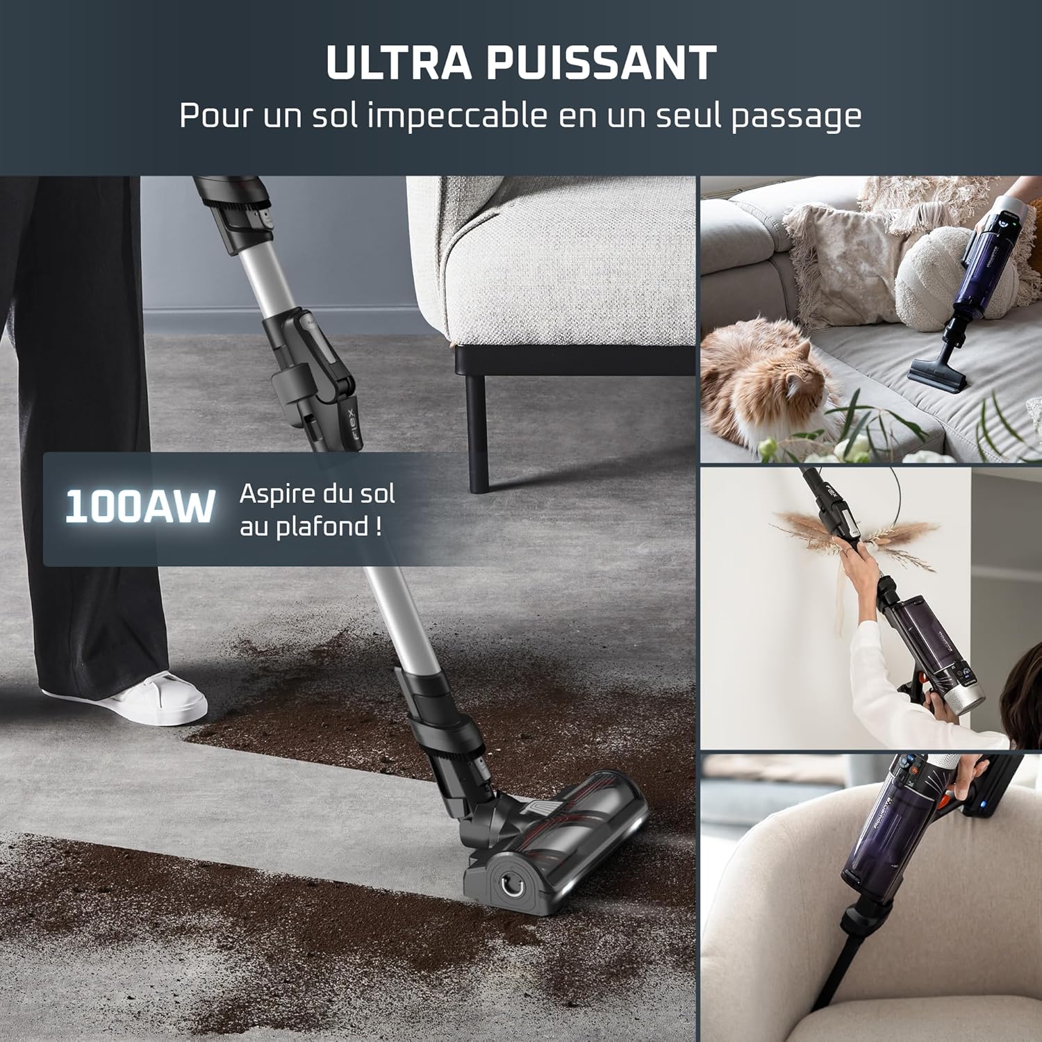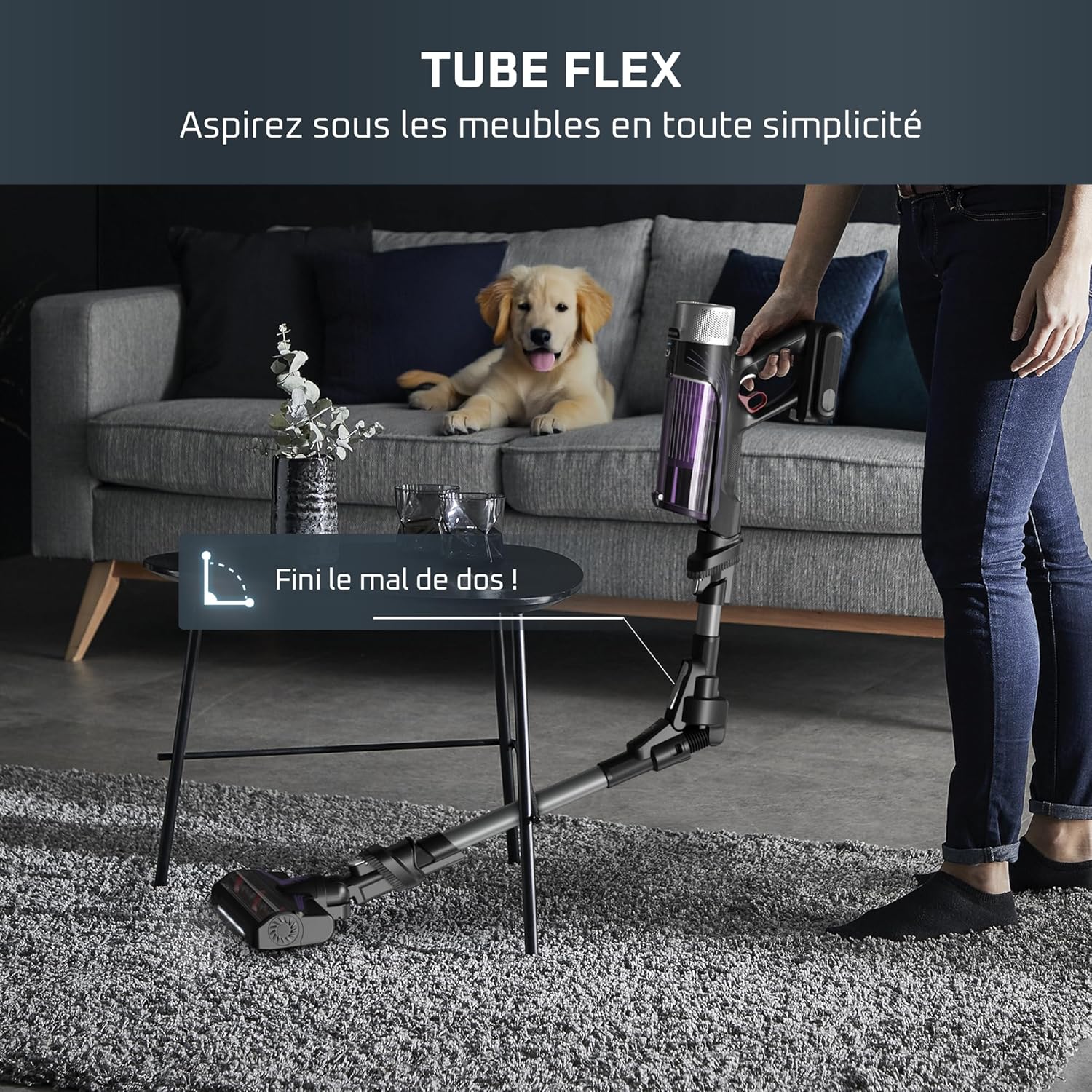 - ATTEIGNEZ L'INATTEIGNABLE, PERCEVEZ L'IMPERCEPTIBLE : son tube Flex permet d'aspirer sous les meubles bas pour un nettoyage complet sans vous pencher tandis que sa tête d’aspiration unique, dotée d'un éclairage avec LEDs, vous permettra de traquer la poussière
